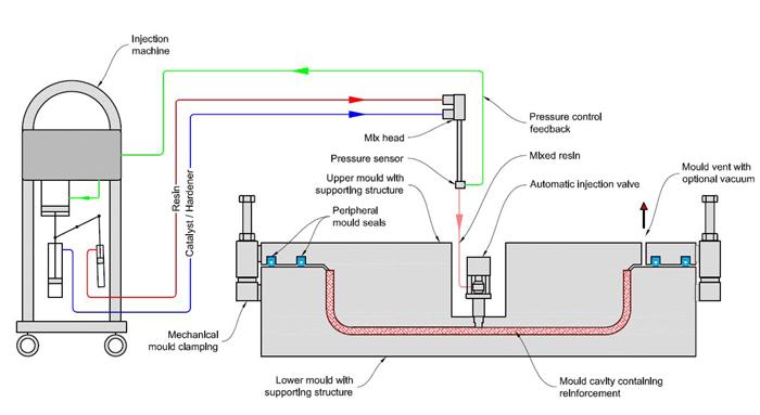 Thermosetting resin, often in the center, is injected directly into the pack-fiber, and the mold is filled by positive hydraulic pressure from the injection machine.